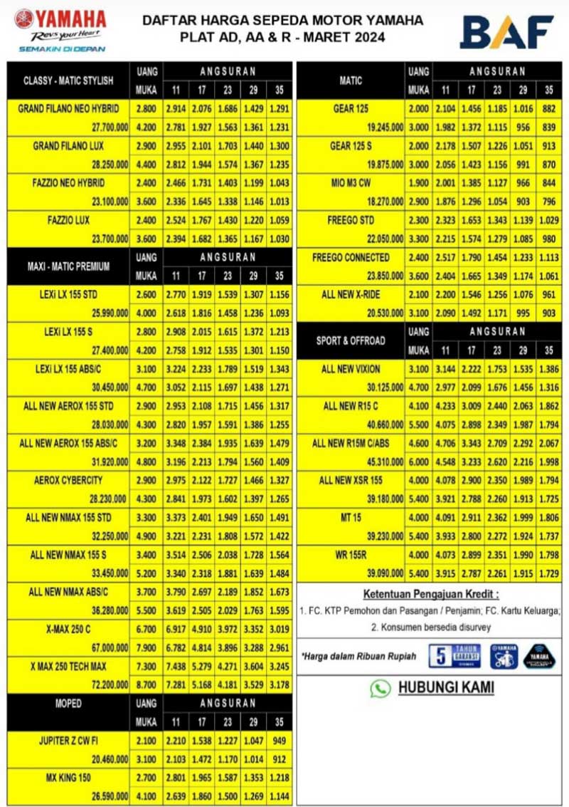 Dapatkan promo terbaik dan harga termurah motor yamaha vega force, jupiter, mx king 150, grand filano, fazzio, gear, mio, x-ride, fino, soul gt, freego, lexi, aerox, nmax, xmax, tmax, vision, xabre, mt-15, xsr 155, mt-15, mt-25, r15, r25, WR 155 R, R1, R6, MT09, WR250 R, MT09 Tracer.